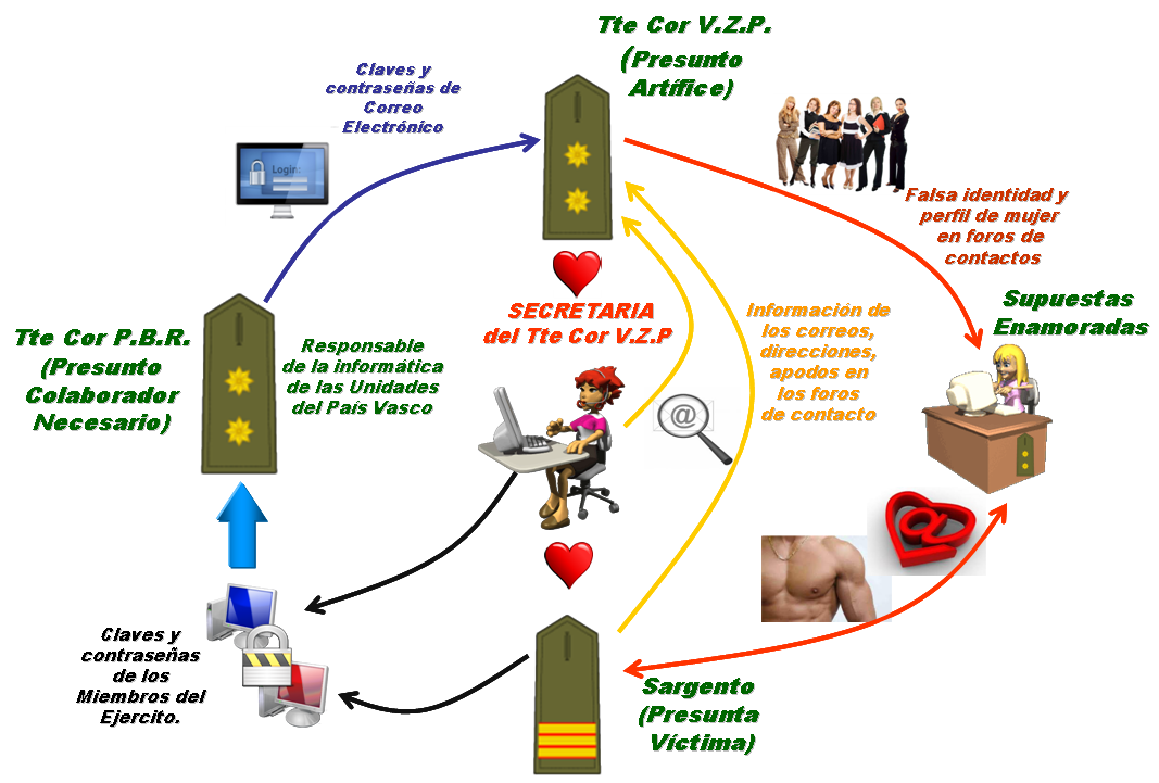El presunto artífice con las claves en su poder se dedicó a examinar los correos electrónicos de la pareja (secretaria-sargento) y a conocer los pormenores de la “vida amorosa” del sargento, obteniendo los apodos y alias que éste utilizaba en los espacios de contacto entre adultos.