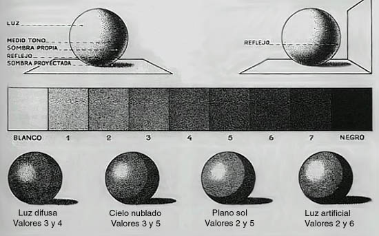 Con la intensificación o la anulación de la luz y las sombras, el tono de color.